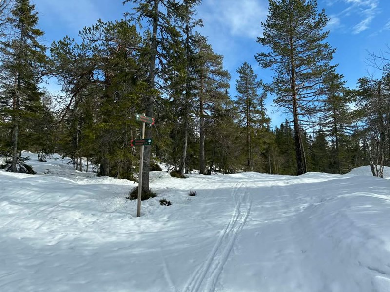 Dette er noen dager siden, krysset ovenfor Skillemyra der løypa deler seg en går ned Syljusæter, til venstre er opp til Nordmarkas Tak Foto Karin