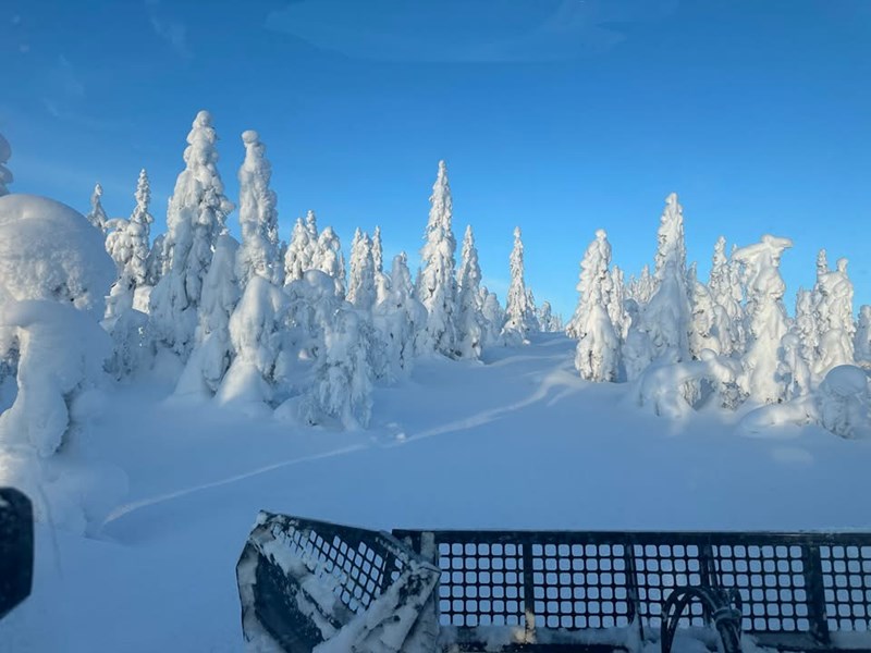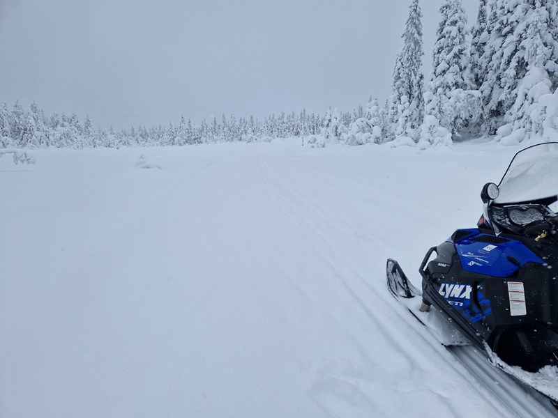 Alle terrengløypene er nå kjørt igjennom, men det er ujevnt underlag med lite snø, det er all grunn til å være forsiktig Det er stein og stubber i og inntil traseen, ikke noe løs snø å falle i. Når en kjører førstegangsløyper i terrenget beveger maskinen og sporsetter seg sidelengs derfor er det satt lite spor, kun på myrer og der hvor det er slett, og da bare et spor.