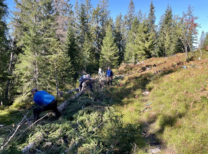 En kavling i Rundløypa trenger oppgradering. Mye toppbrekk i nærheten, så kortreist virke. Anders Heger og Thomas Knutzen med sag og saks. Foto: Lene Li Dragland