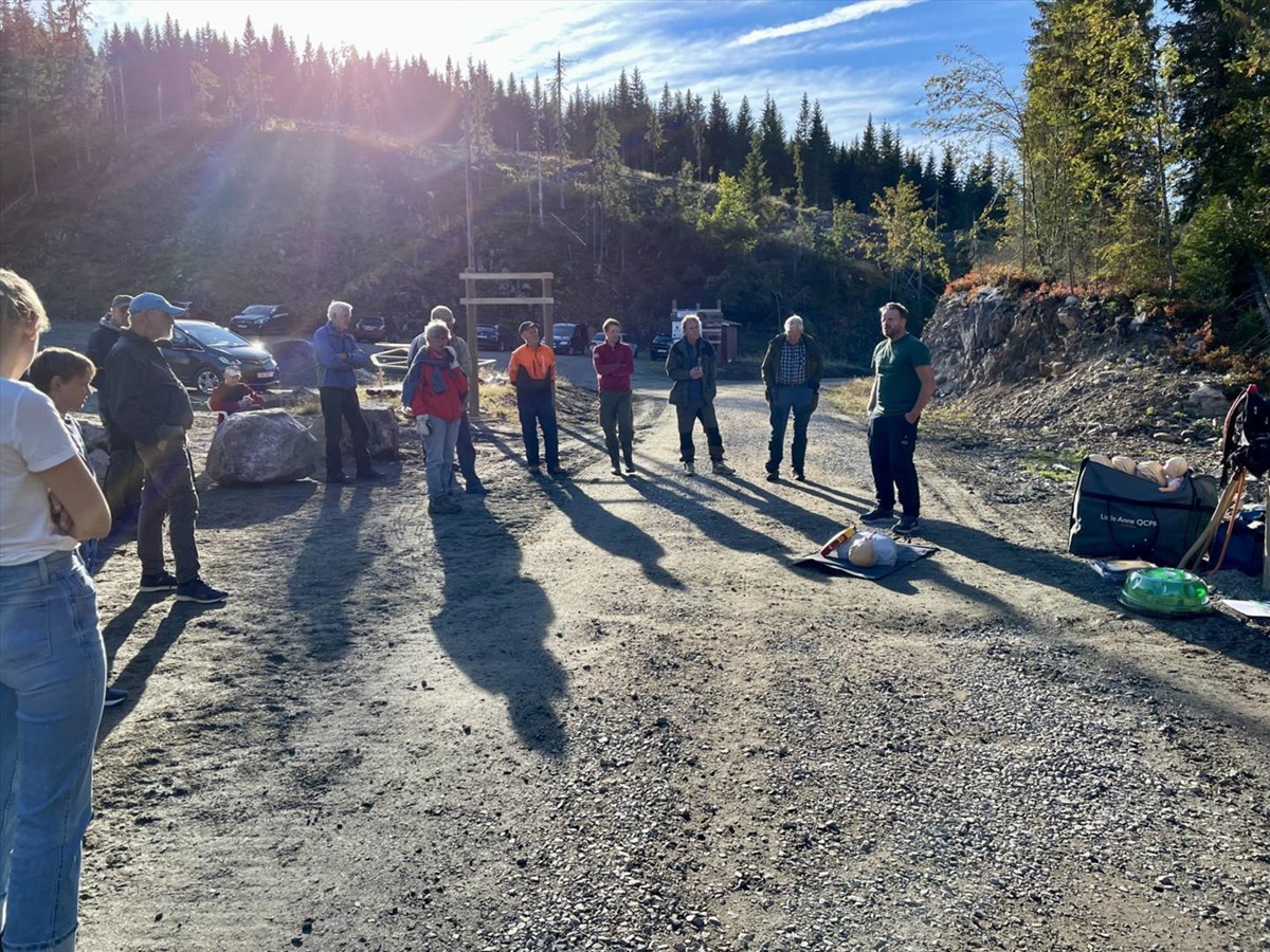 Flott oppmøte, leder Tore deler ut dagens oppgaver: (f.v.) Kjell Ivar Skjemstad, Eirik Formo, Stian Hauger, Kåre Hansen, Anders Heger, Olaf Godli, Harald Martinsen, Tore Heldrup Rasmussen, Rangar Bang Huseby, Knut Pedersen, Lars Petter Fjeld og Trond Faanes. Foto: Lene Li Dragland