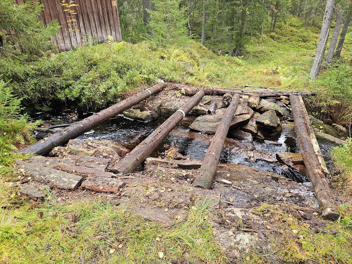 Vi la i flere stokker over denne bekken så løypemaskinen kommer over bekken. Foto: Lene Li Dragland