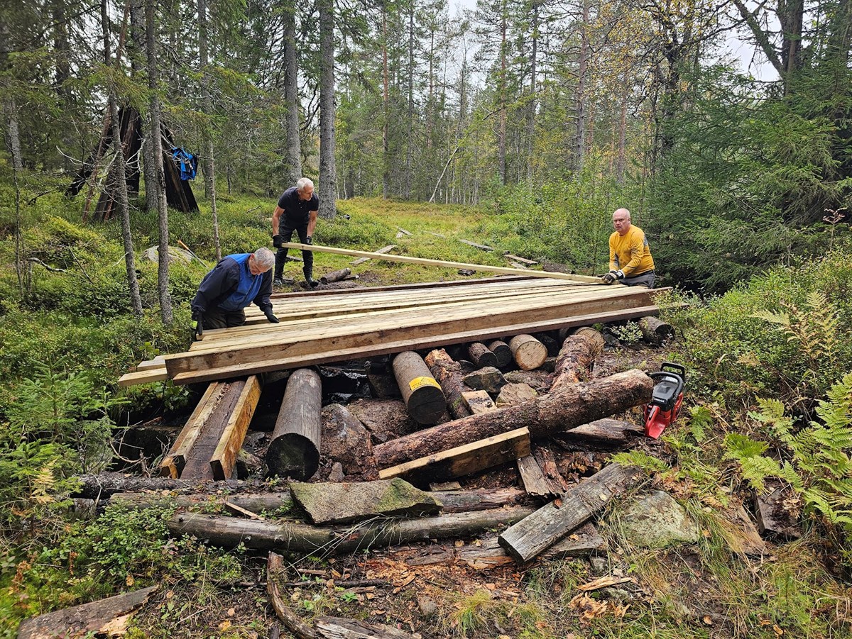 Lars Petter skrur fast plank. Og vi ser at det må hentes inn flere planker for å få tett bru. Foto: Trond Urdal.
