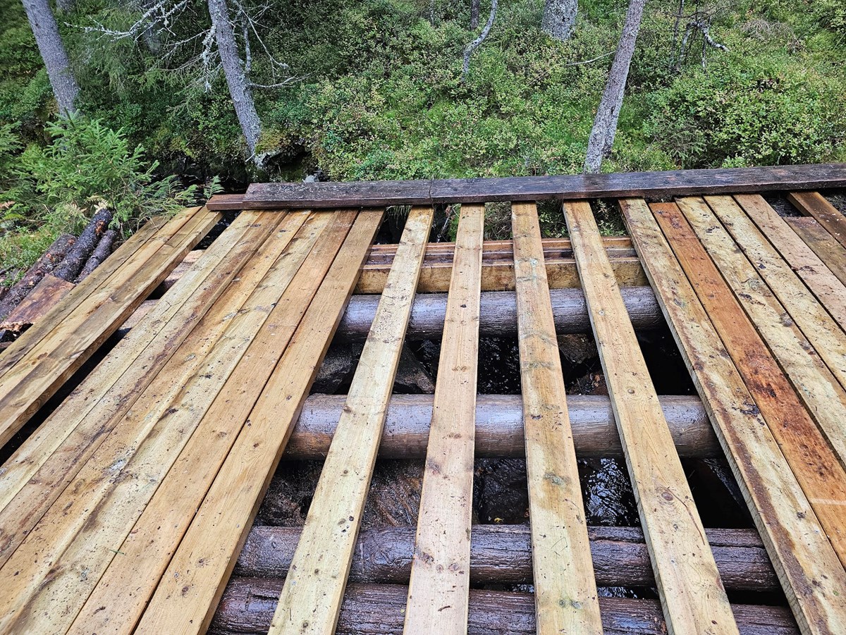 Brua ved Svartbekkhytta var råtten, kyrene har gått gjennom bordene. Første økt: fjerne gamle bord. . Foto: Lars Petter Fjeld