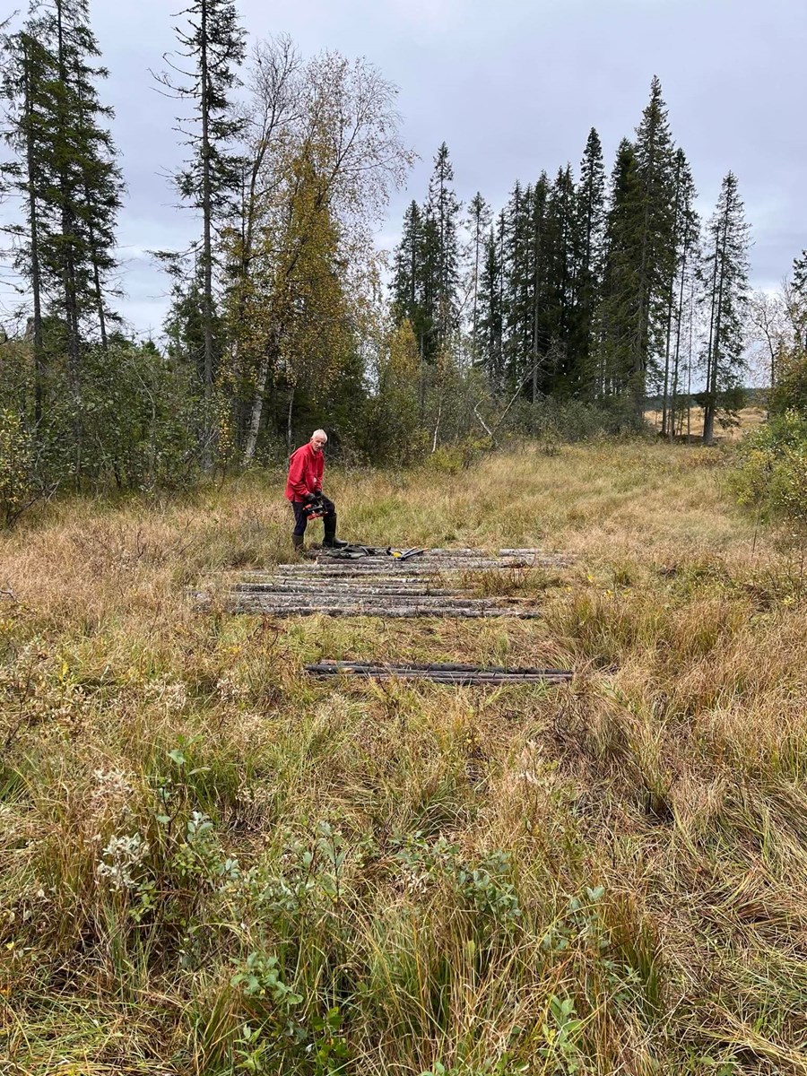 Olaf med motorsaga fjerner høye stubber i løypa Svea-Stormyra-Volla. Foto: Hege Marie Haakenstad Godli