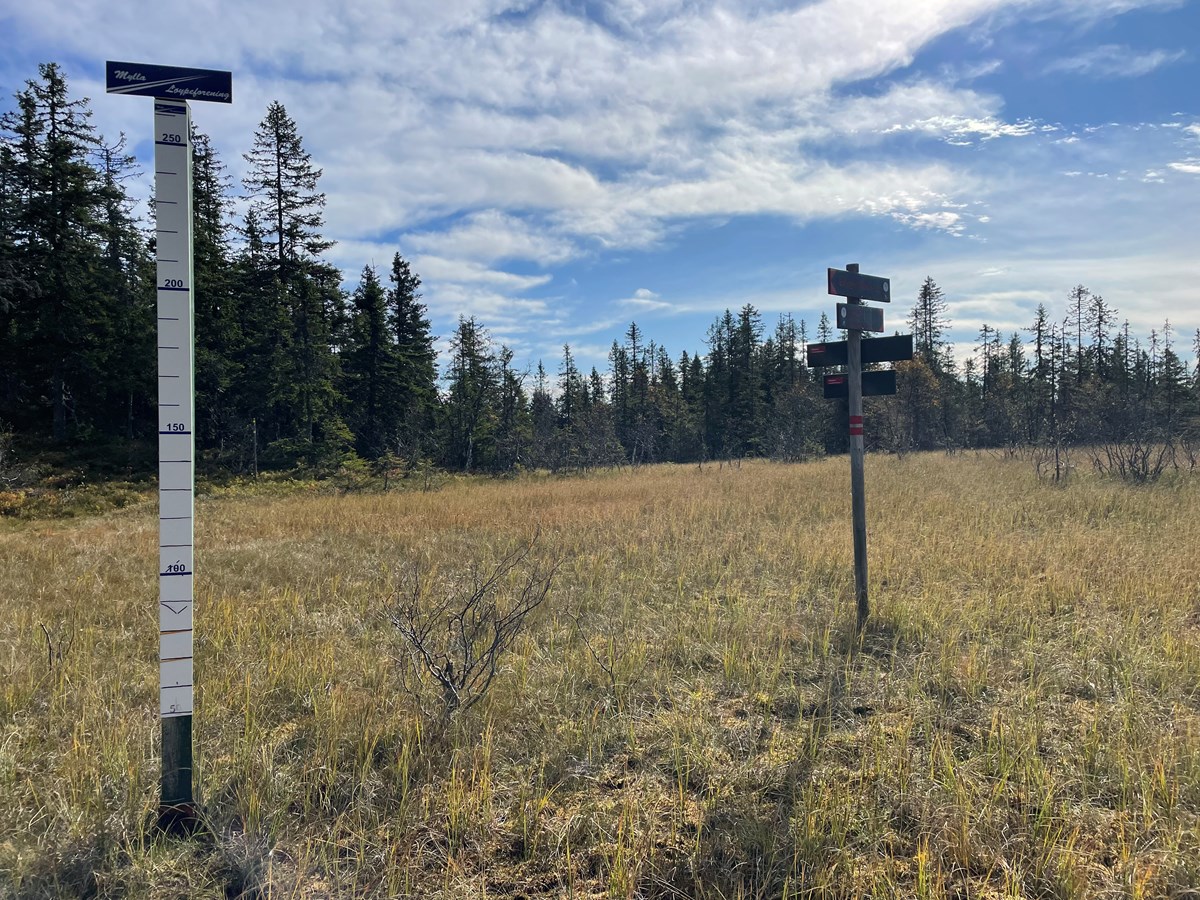 Frisket opp strekene på målestaven på Bislingflaka også. Denne staven suges ned i myra, trekk fra 10 cm. Foto: Lene Li Dragland