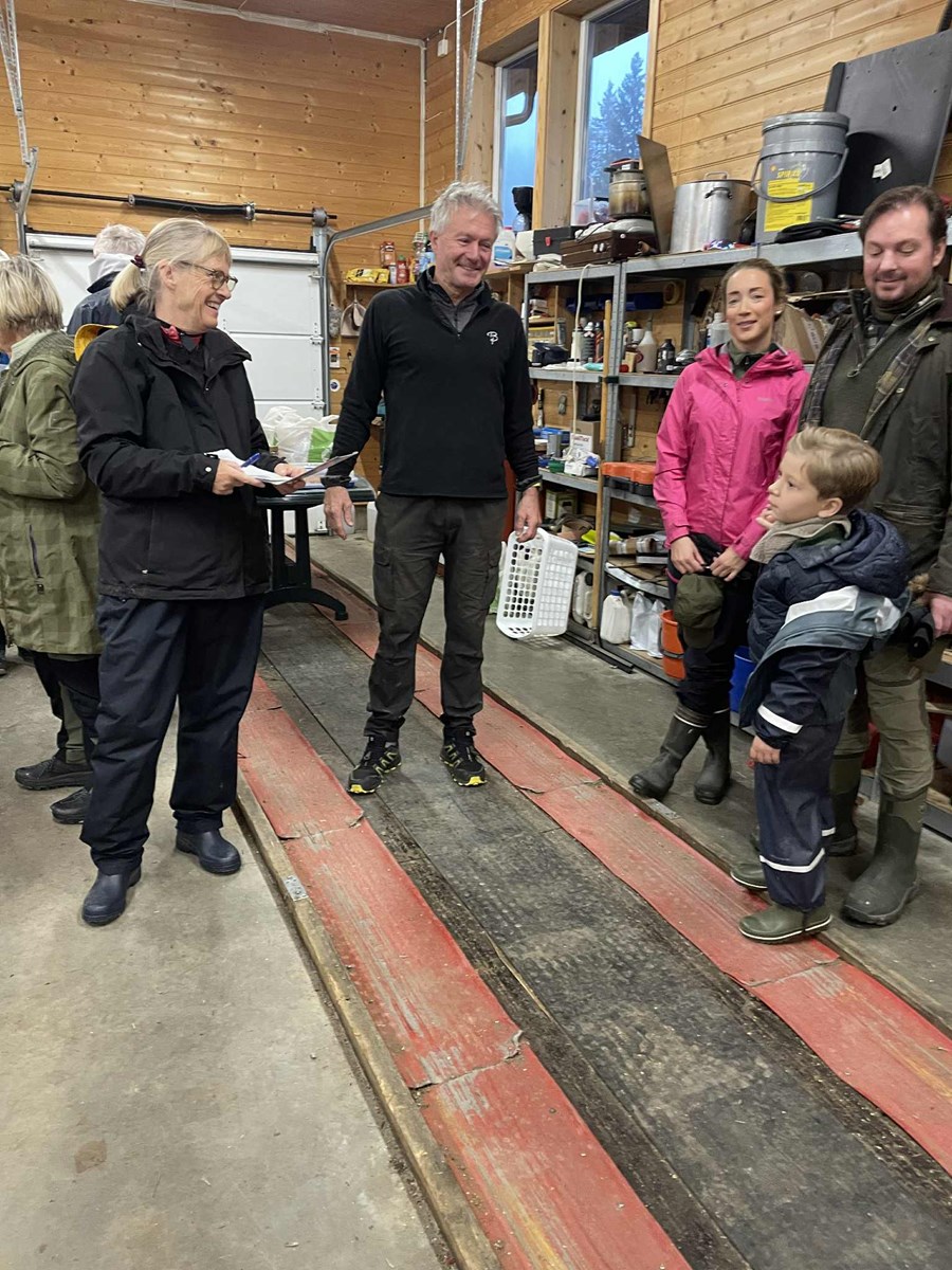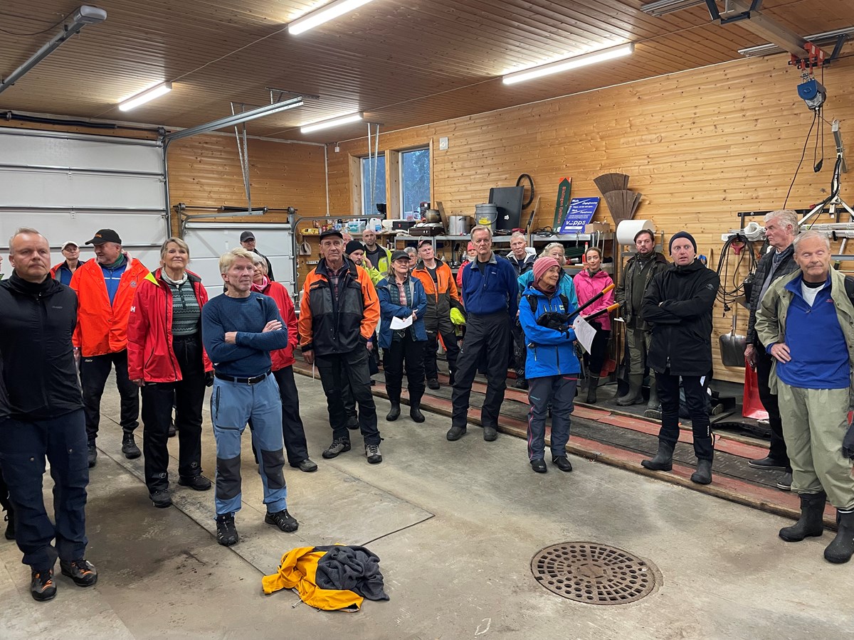 Tore Heldrup Rasmussen deler ut dugnadens arbeidsoppgaver. Denne gangen samlet vi oss inne i Myllagarasjen. Bøtteregn ute – hele dagen. Fantastisk at 46 tøffinger møtte til dugnaden! Foto: Lene Li Dragland