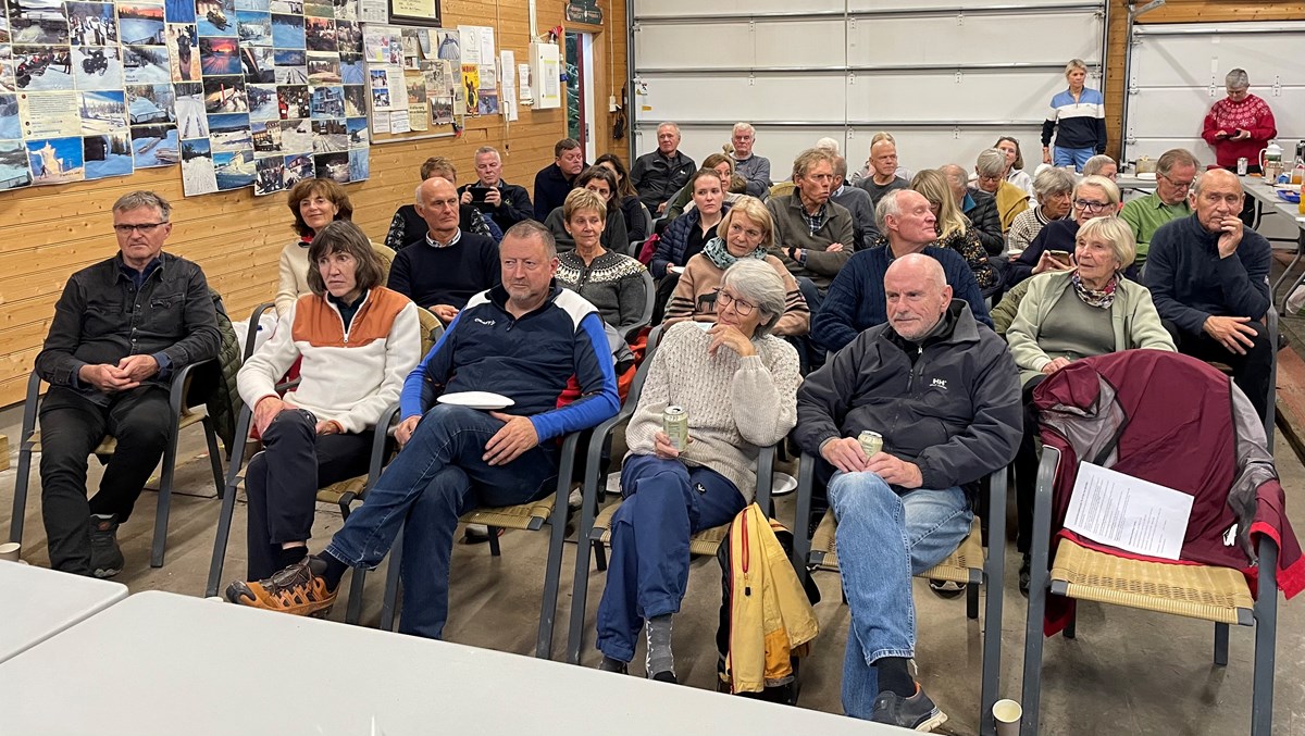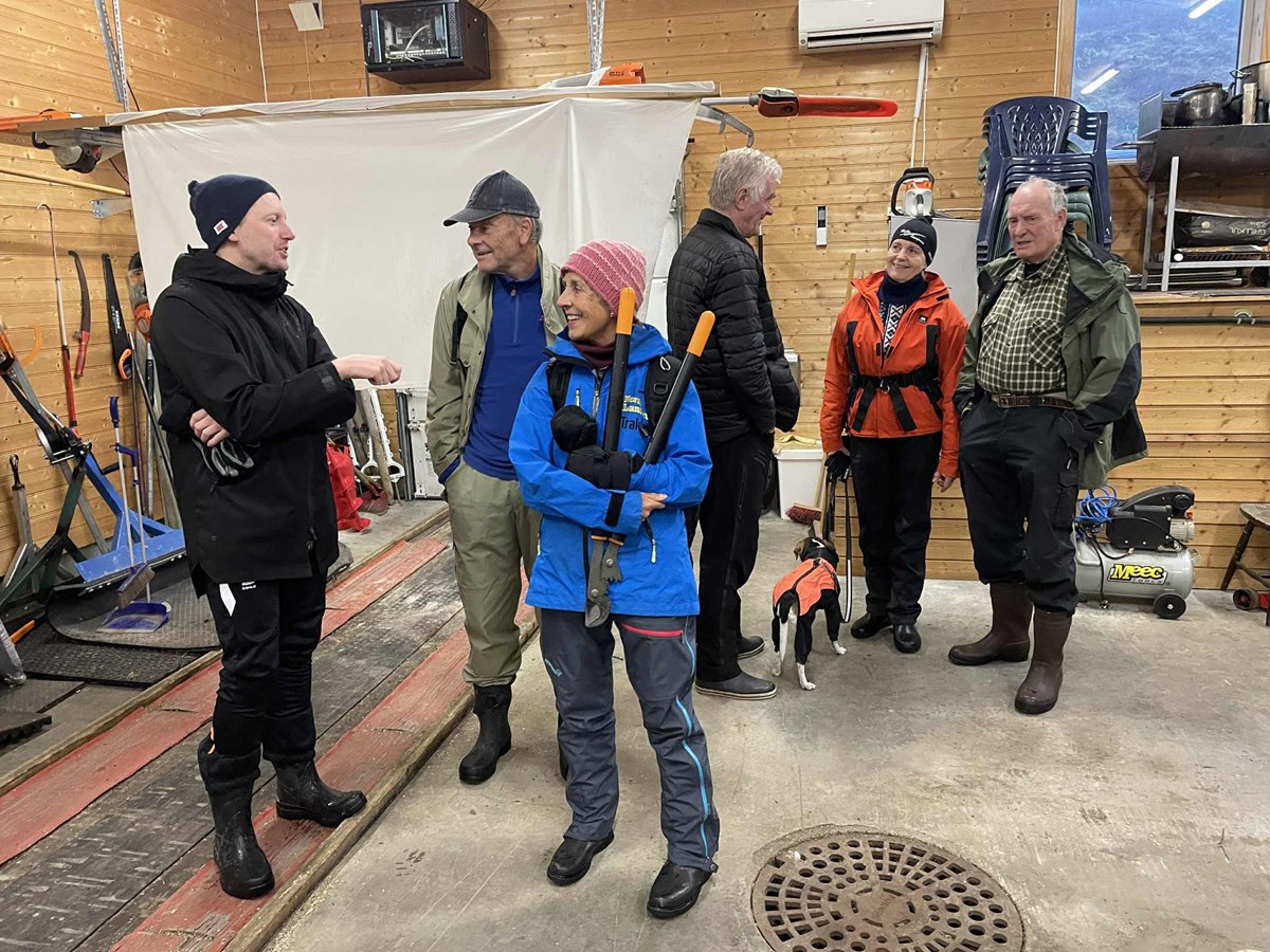 Dugnadsgjengens arbeidsoppgaver fordeles i Myllagarasjen. Foto: Lene Li Dragland