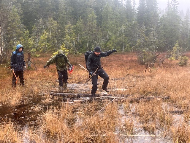 Våt dugnad for Arne, Lars og Pål i Grønntjernløypa. Foto: Thorvald Grung Moe