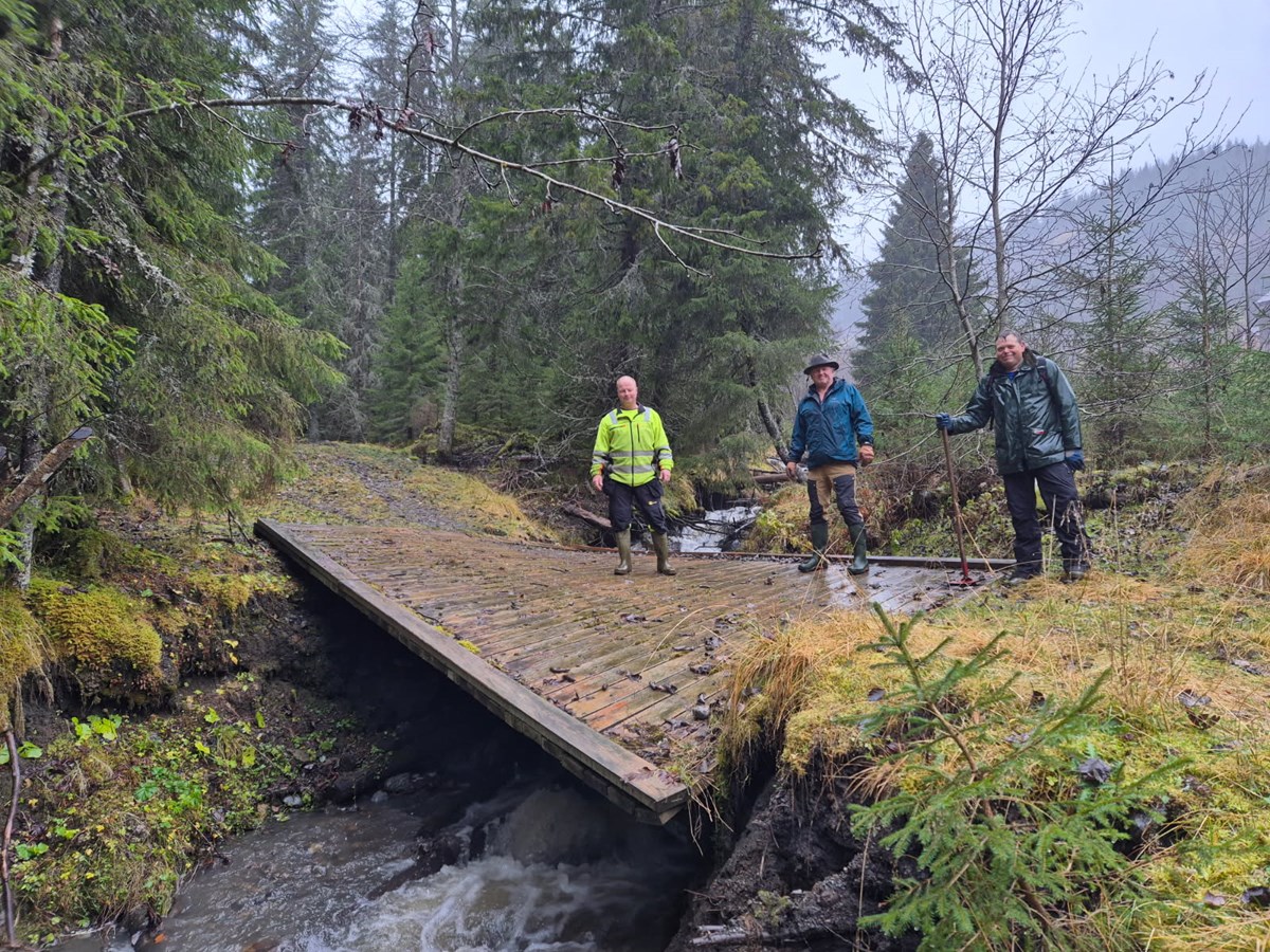 Våteste dugnad i manns minne. Brua i Vestend tatt av flommen. Bård, Sverre og Tore Brovold. Foto: Tore Heldrup Rasmussen